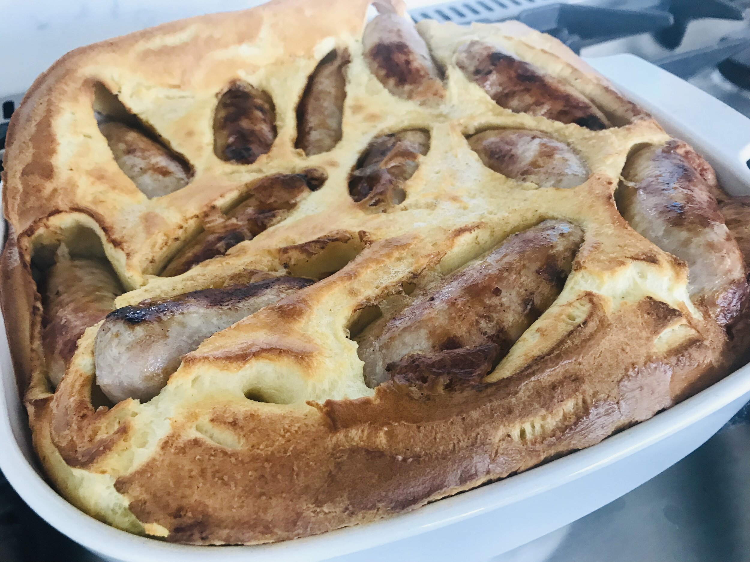3. Put a good drizzle of olive oil into a medium dish and put into oven for 5 minutes. Take out and add the sausages then pour over the batter and put back in oven for about 20-25 minutes, until puffed up and golden.